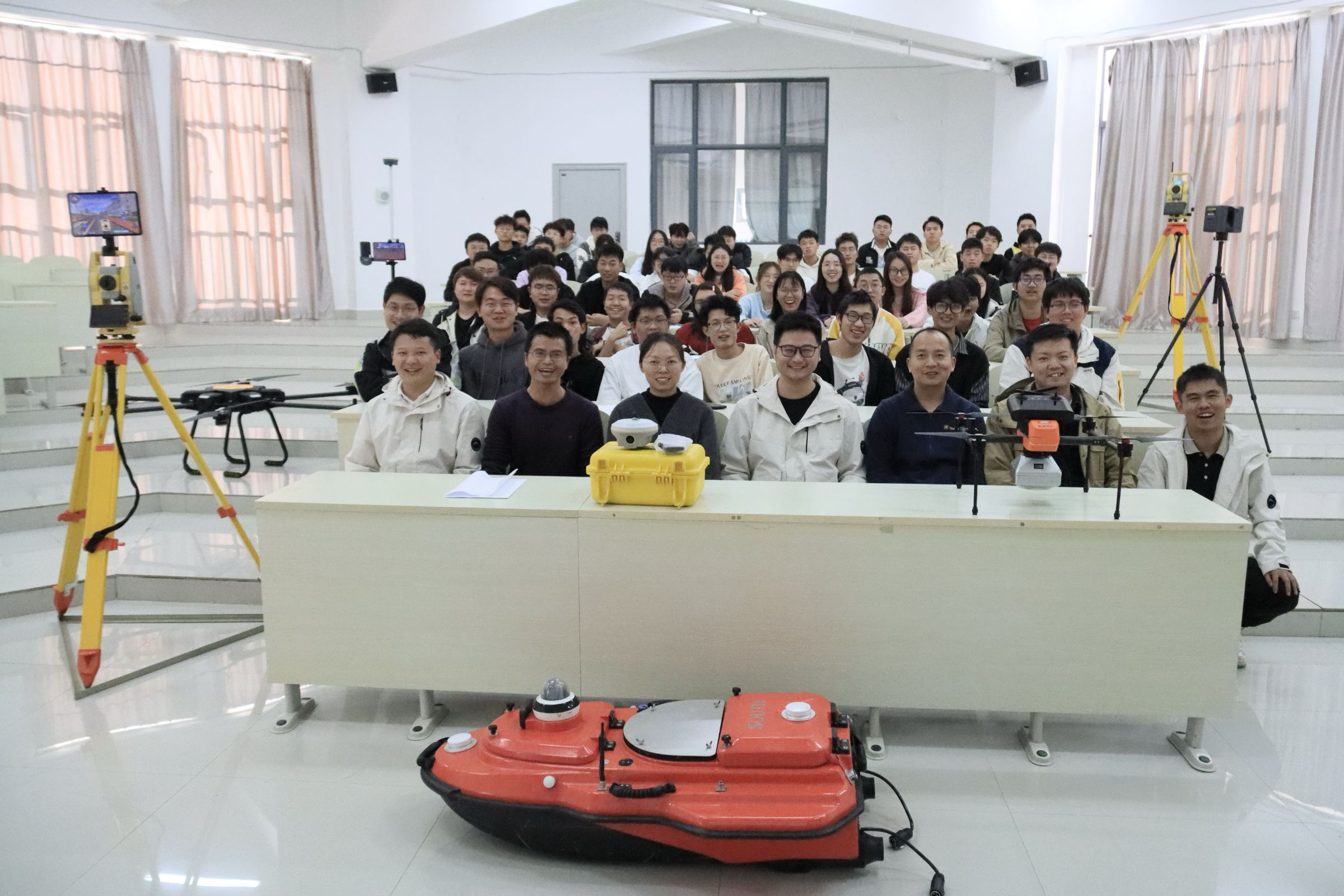 在公教楼307门口的大厅中,南方测绘展示了智能航测无人机、SU20无人船、智能测量自动全站仪、激光三维扫描仪、虚实协同一体化系统等一大批测绘科技装备与新技术,得到师生的广泛关注,营造了浓厚的校园科技氛围。