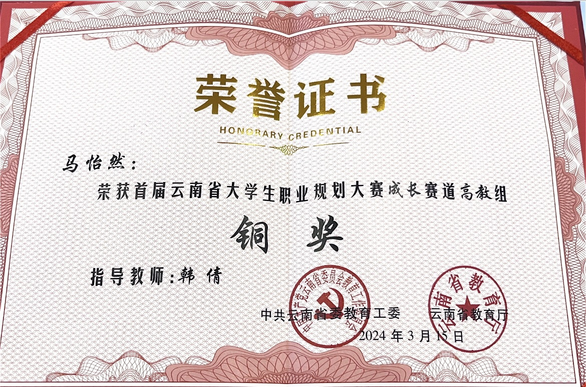 2024年3月13日至15日,由中共云南省委教育工委、云南省教育厅主办的首届云南省大学生职业规划大赛省级决赛在云南农业大学举行,来自全省83所高校的25.7万名师生报名参与。通过校赛选拔和省级复赛,120名学生和42名教师晋级省级决赛。经过激烈角逐,我校语言文化学院大三学生马怡然喜获成长赛道高教组“铜奖”。